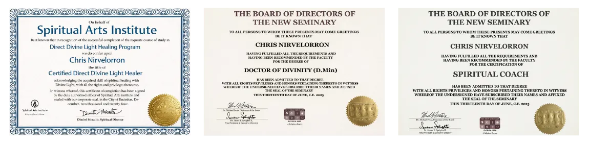 Rev. Dr. Chris Nirvelorron is a Doctor of Divinity from the New Seminary, an ordained senior associate Interfaith ministder, certified spiritual coach, certified Divine Light energy healer from the mystic esoteric schoolhouse of Spiritual Arts Institute and the founder of TriEssence Energetic Coaching.